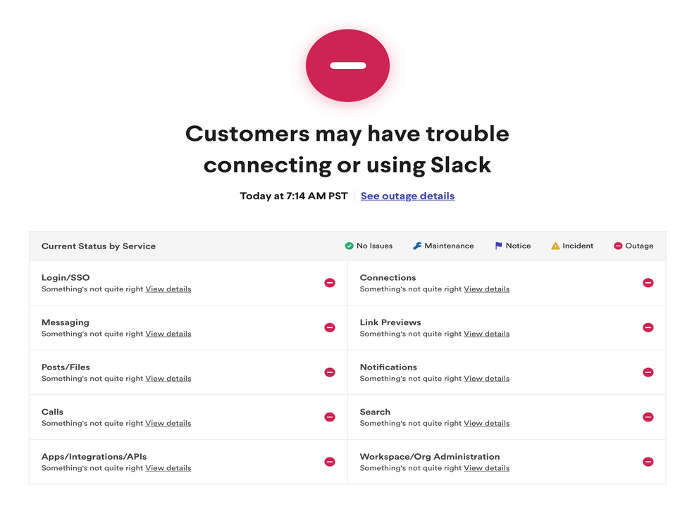 Slack outage page. No incidents reported today. Slack is a proprietary business communication platform developed by American software company Slack Technologies and owned by Salesforce from. Had a major outage.