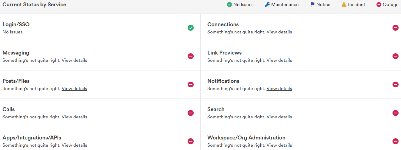 Slack is a distributed platform and during any given incident it is rare for all Slack teams to be affected. No incidents or maintenance related to this downtime. Major Outage Maintenance Scheduled Maintenance.
